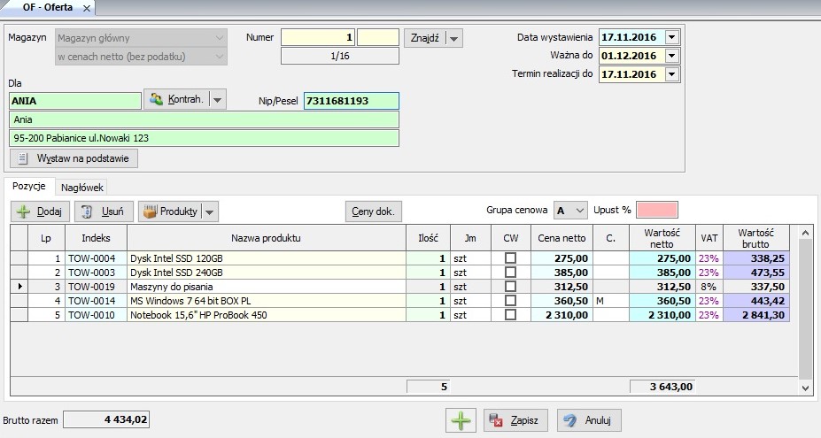 uwzględniając wybraną grupę cenową i udzielony upust. Jeżeli