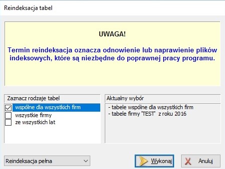 UWAGA! Reindeksacji nie można przerwać!!!