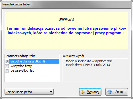 Uwaga! Dostatecznym powodem wykonania reindeksacji zbiorów jest pojawienie się podczas pracy w programie komunikatów: "Index is out of date" lub "Index is not exist".