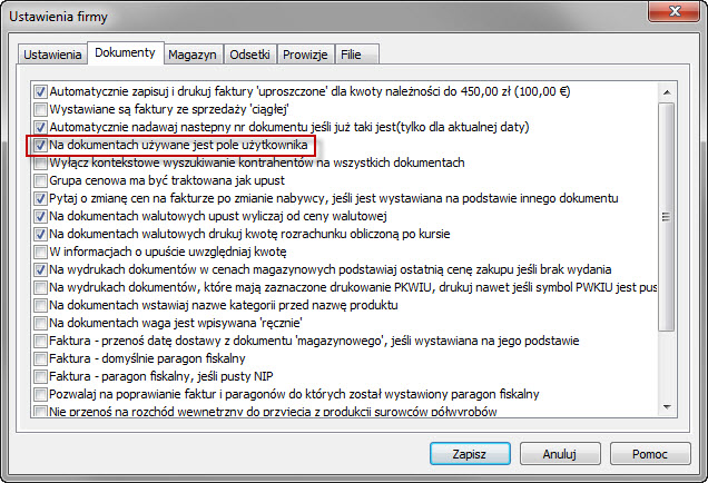 1. W opcjach firmy zaznaczyć
