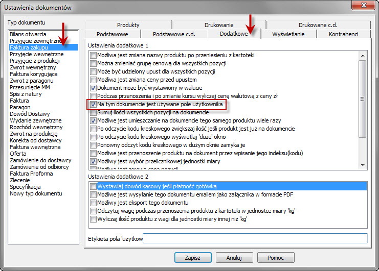 2. W opcjach dokumentów dla faktury zakupu (FZ) zaznaczyć