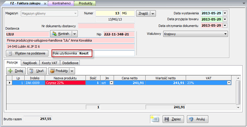 Jeśli w polu użytkownika w Famie dla faktury zakupu (FZ) jest