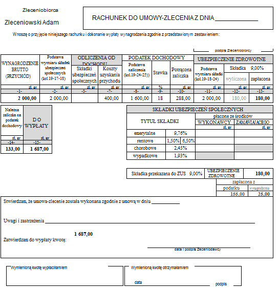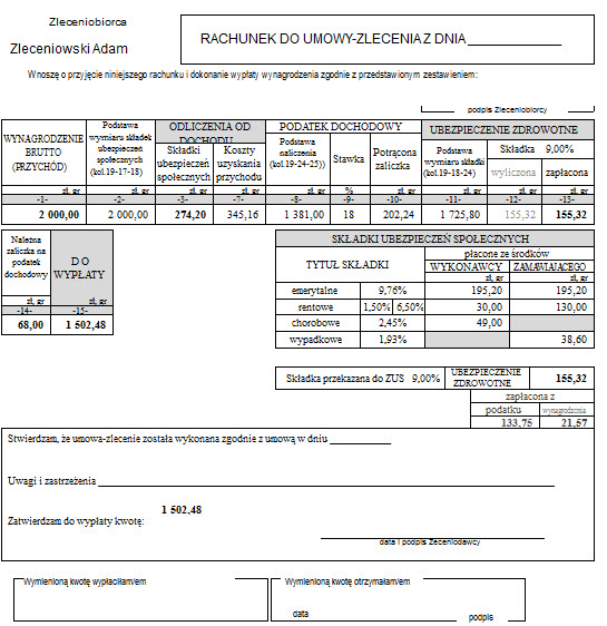Na rysunkach przykład rachunku bez składek ZUS tylko z